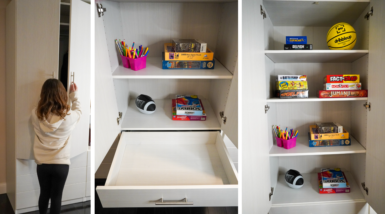 Adjustable Shelves & Full Extension Drawers means plenty of room for toys, arts & crafts and more