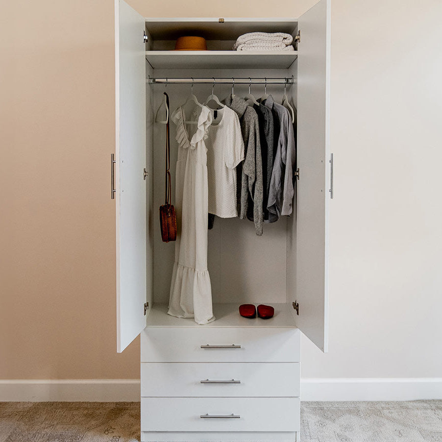 Flex Cabinets come in two sizes with three equal-size drawers, adjustable shelves, and a wardrobe rod to suit various room layouts.