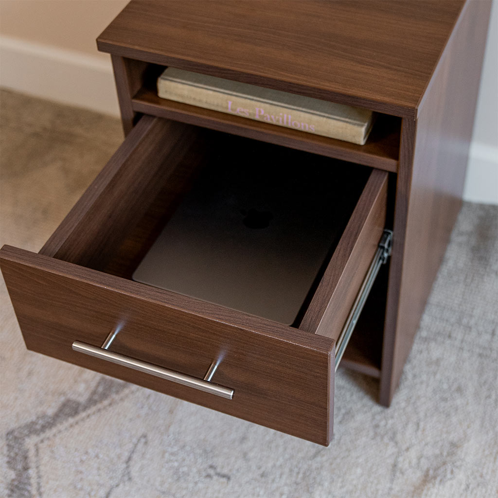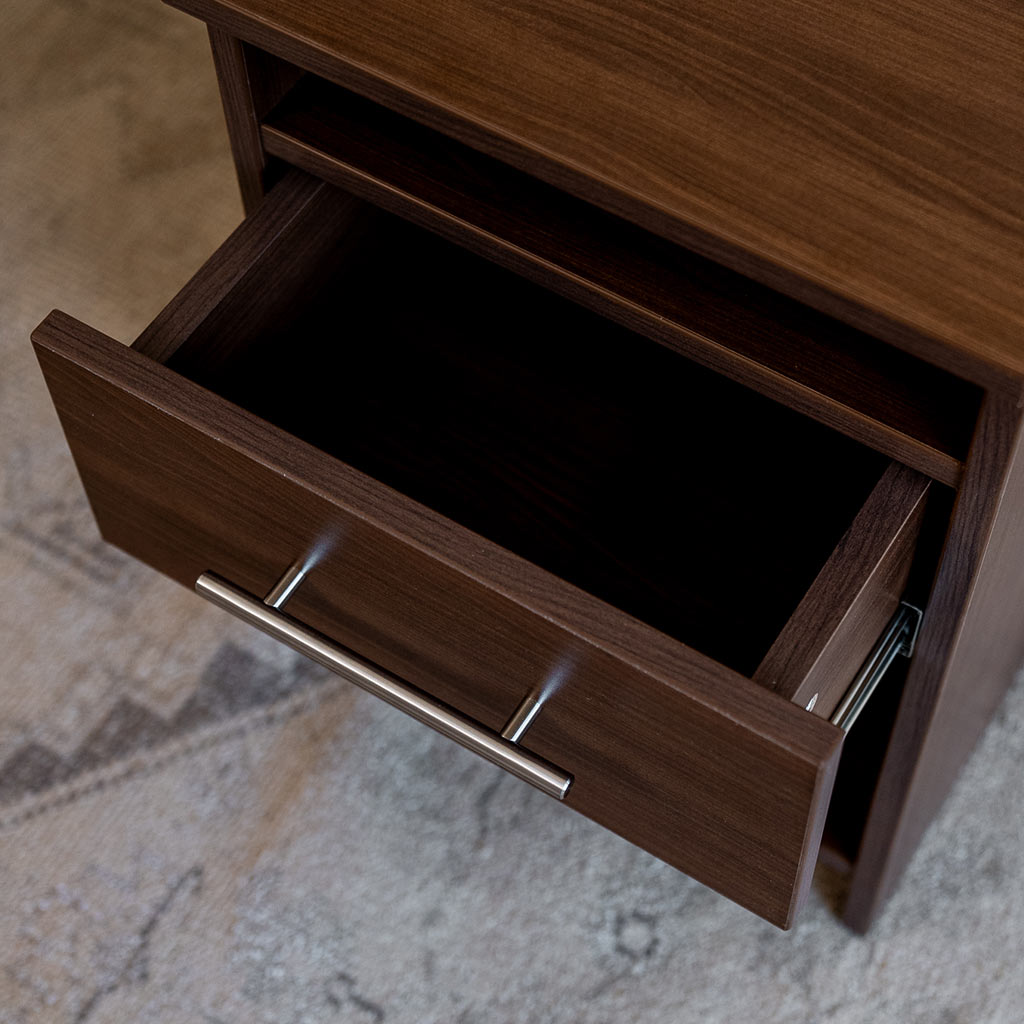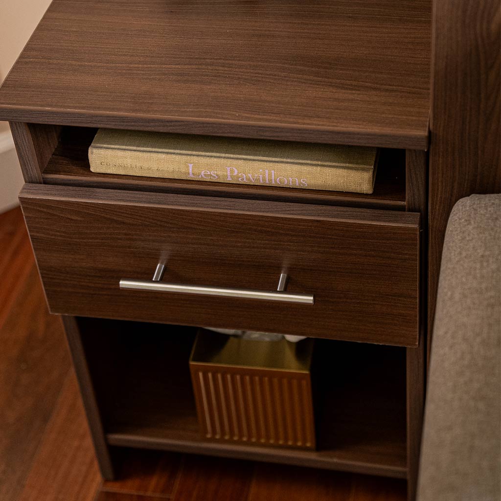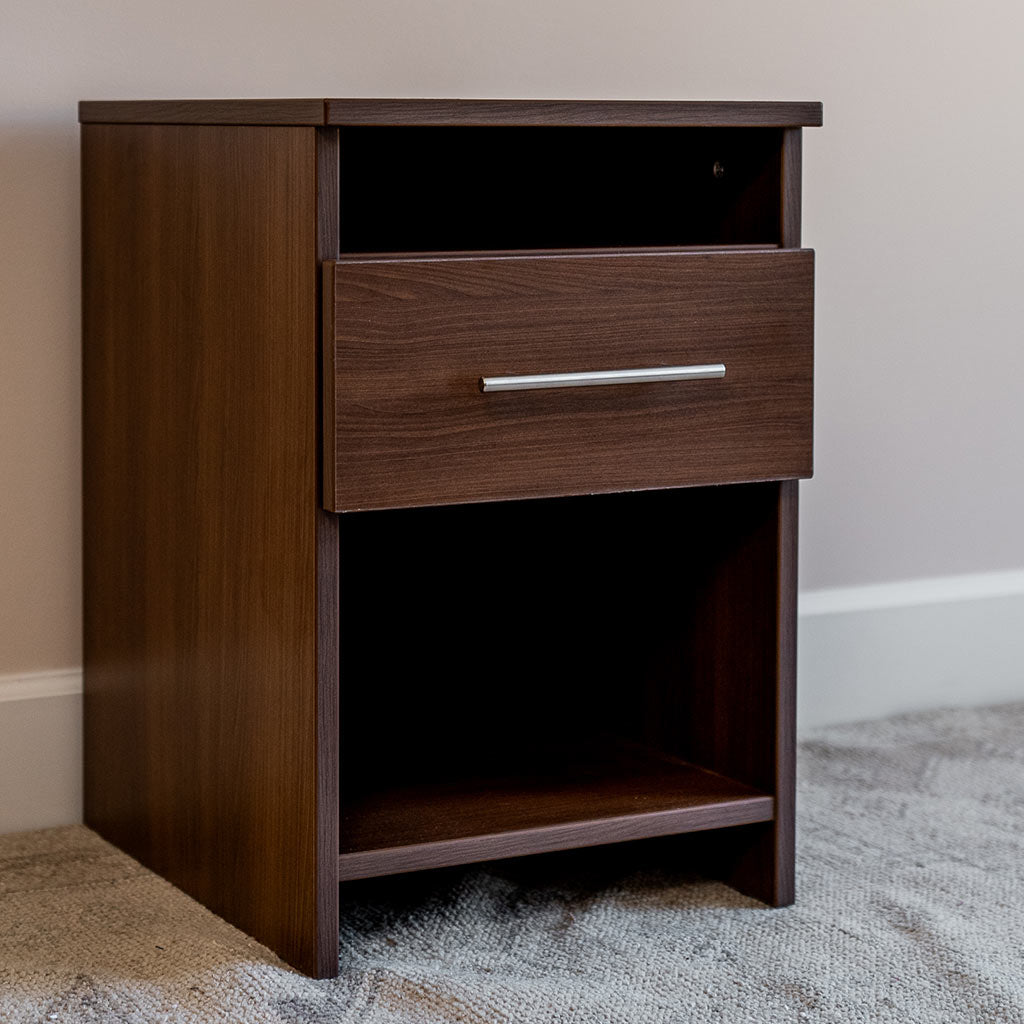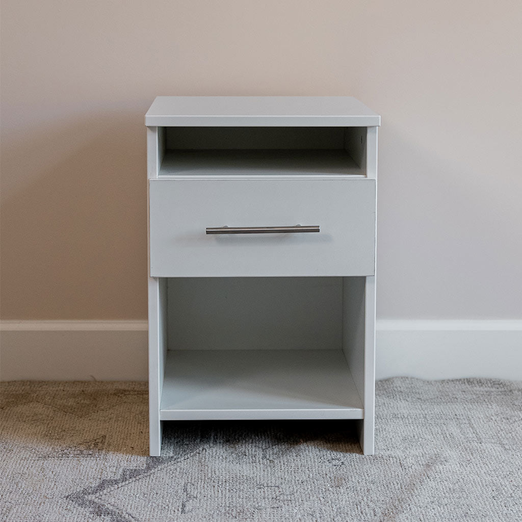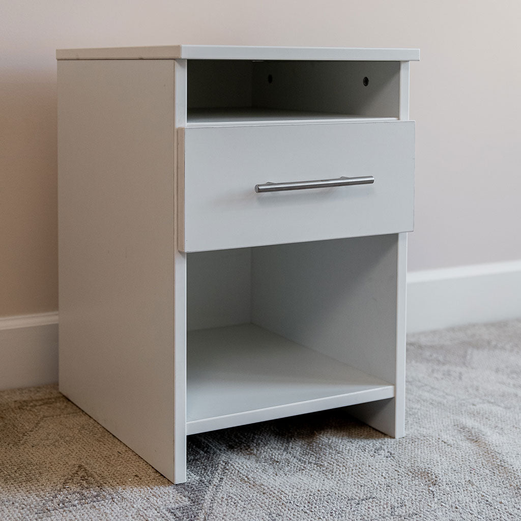 The nightstand is constructed with 3/4" thick engineered wood throughout and includes medium-duty (100 lb) full-extension drawer slides for easy access even to the very back of the drawer.