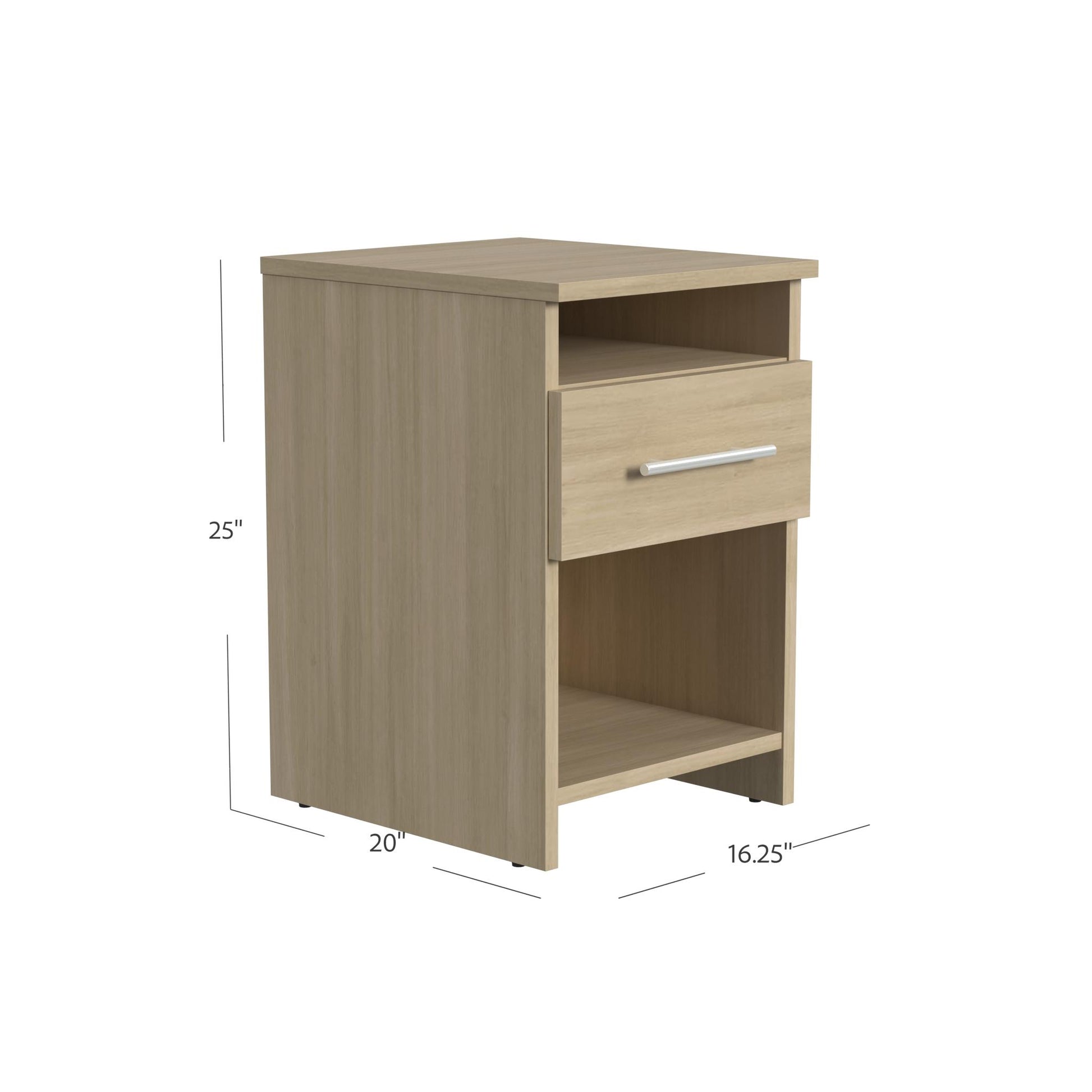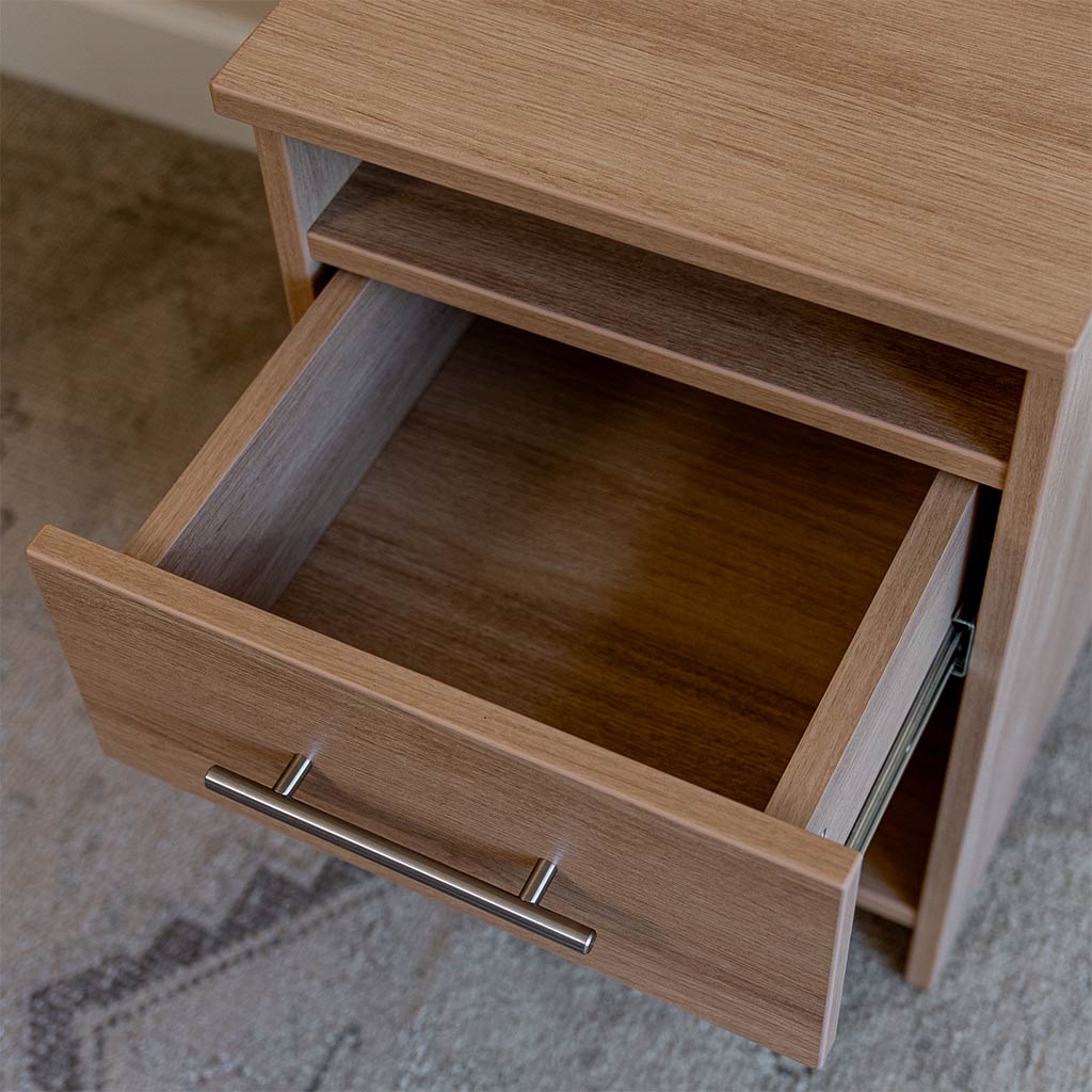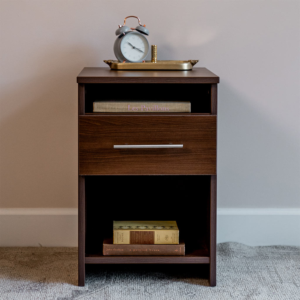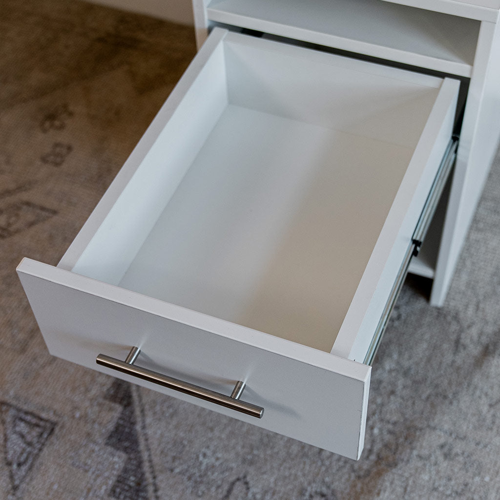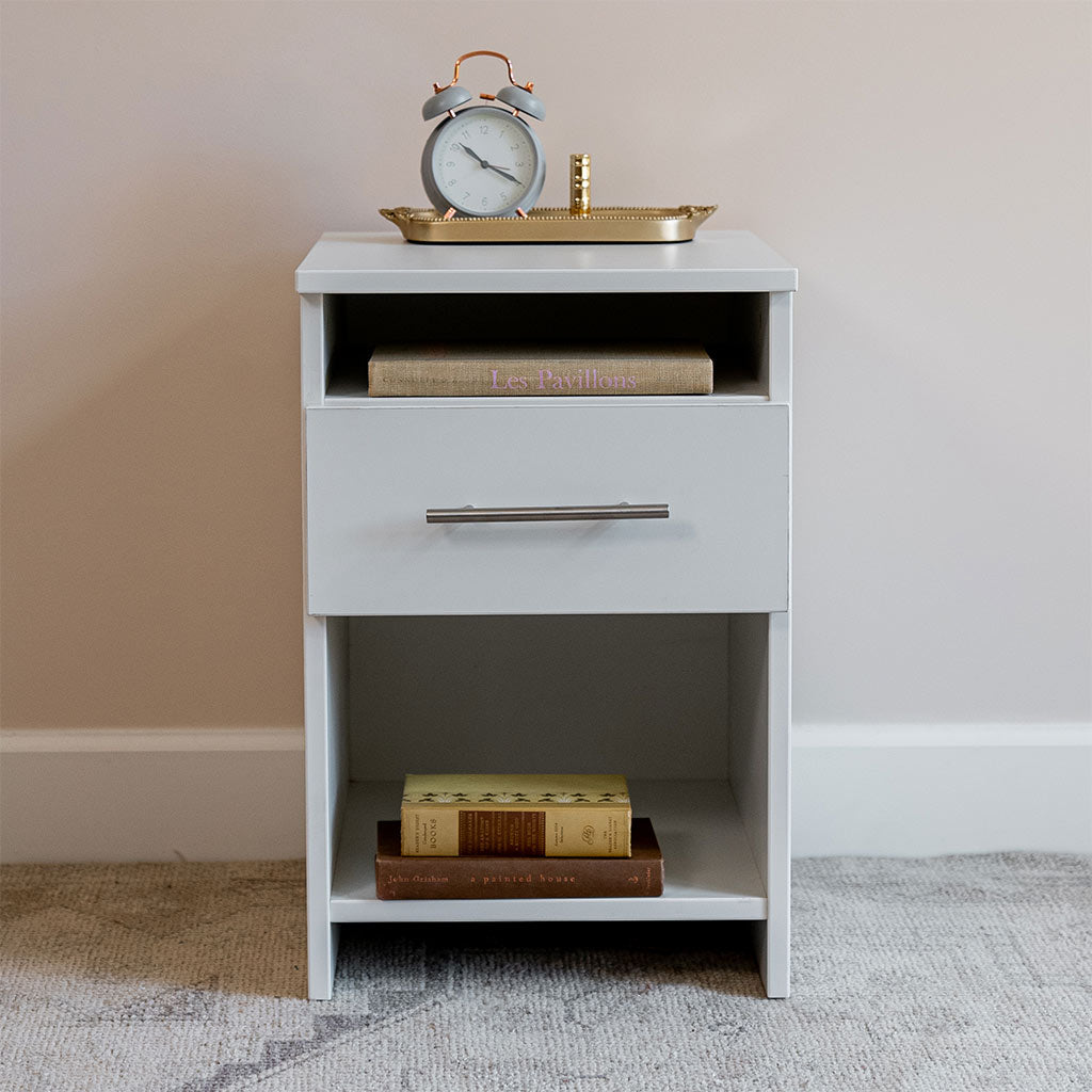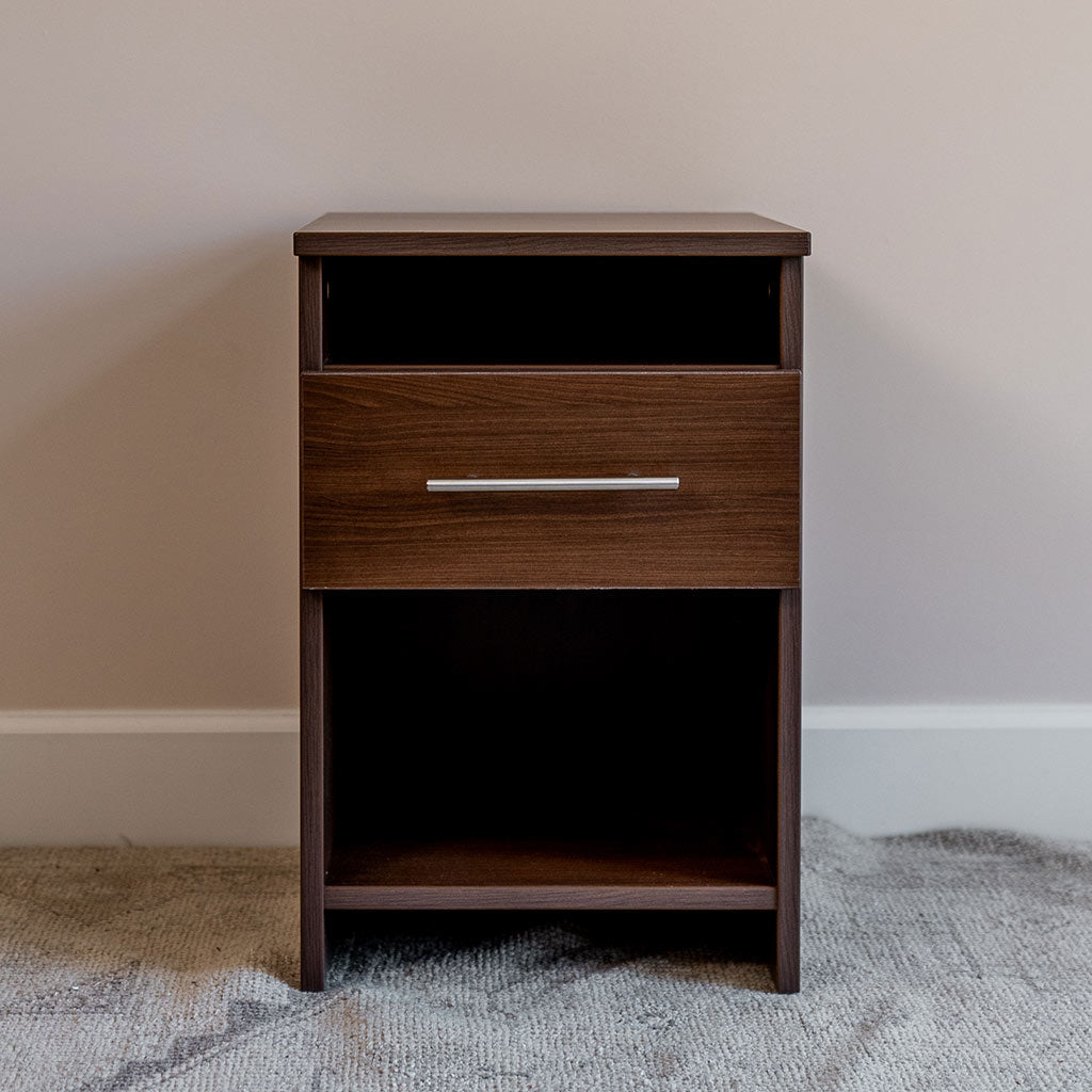 The nightstand is constructed with 3/4" thick engineered wood throughout and includes medium-duty (100 lb) full-extension drawer slides for easy access even to the very back of the drawer.