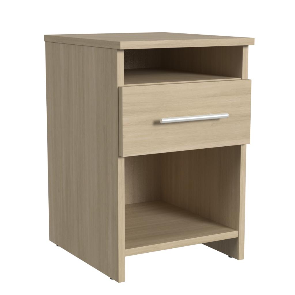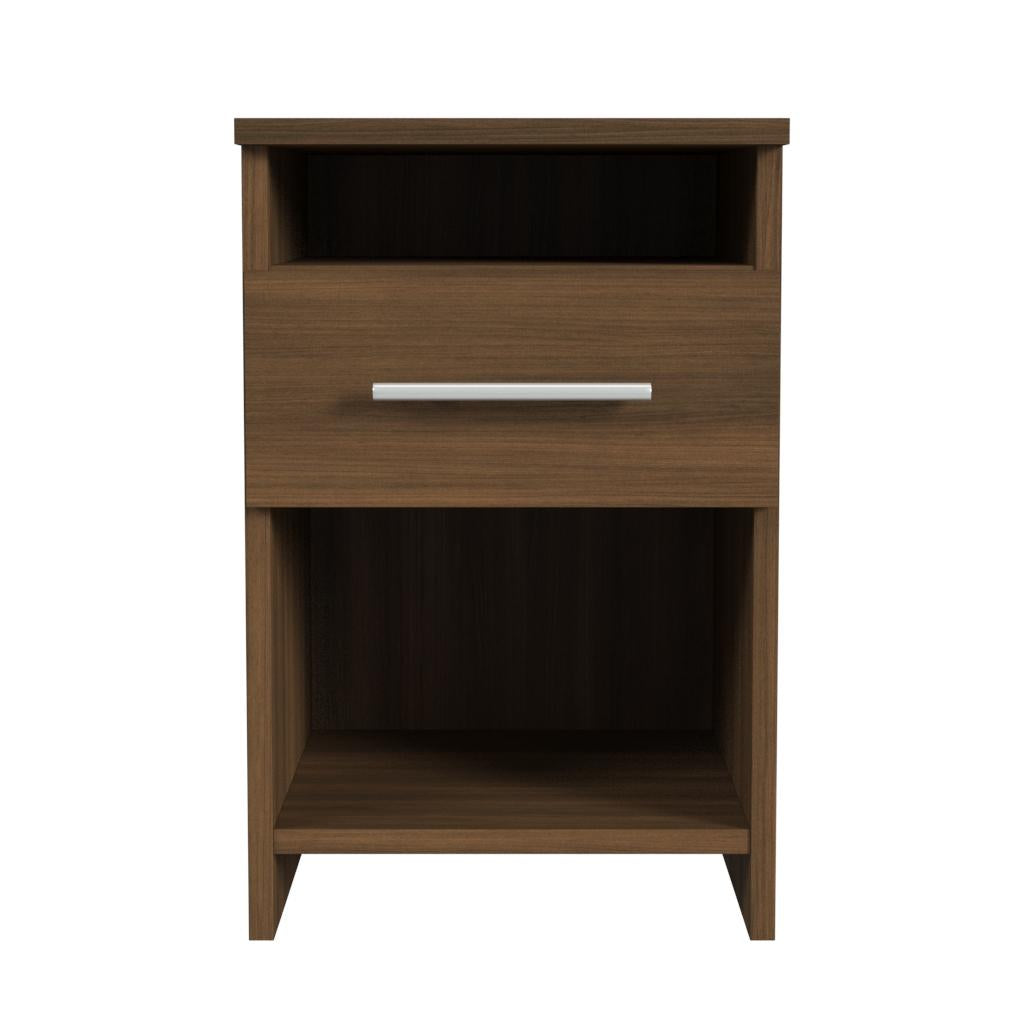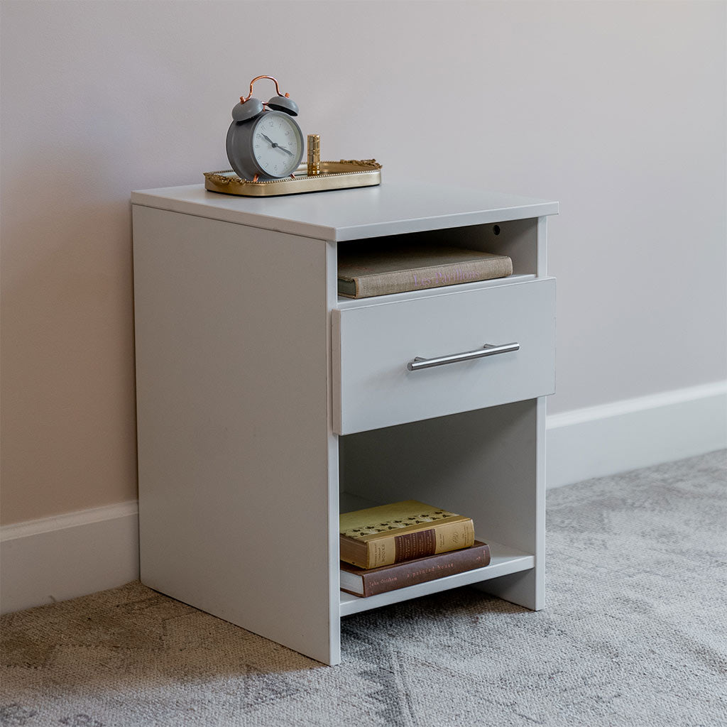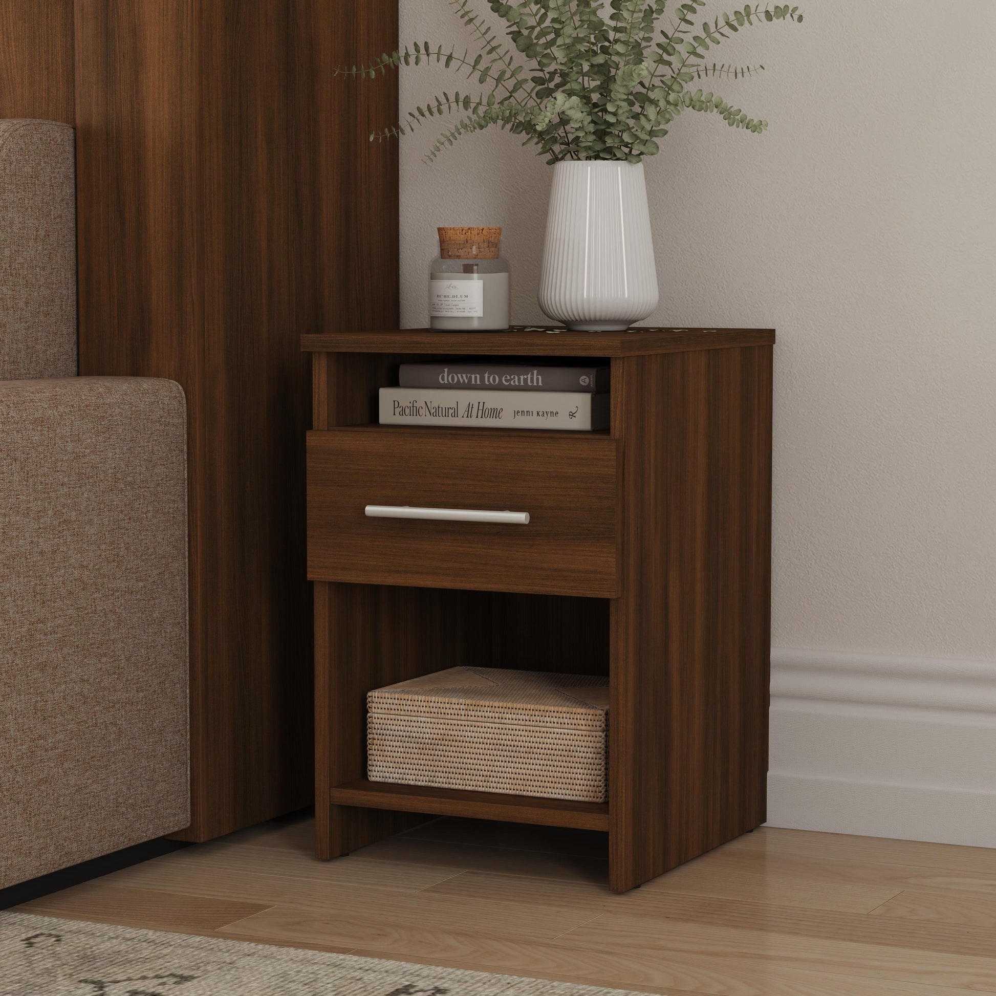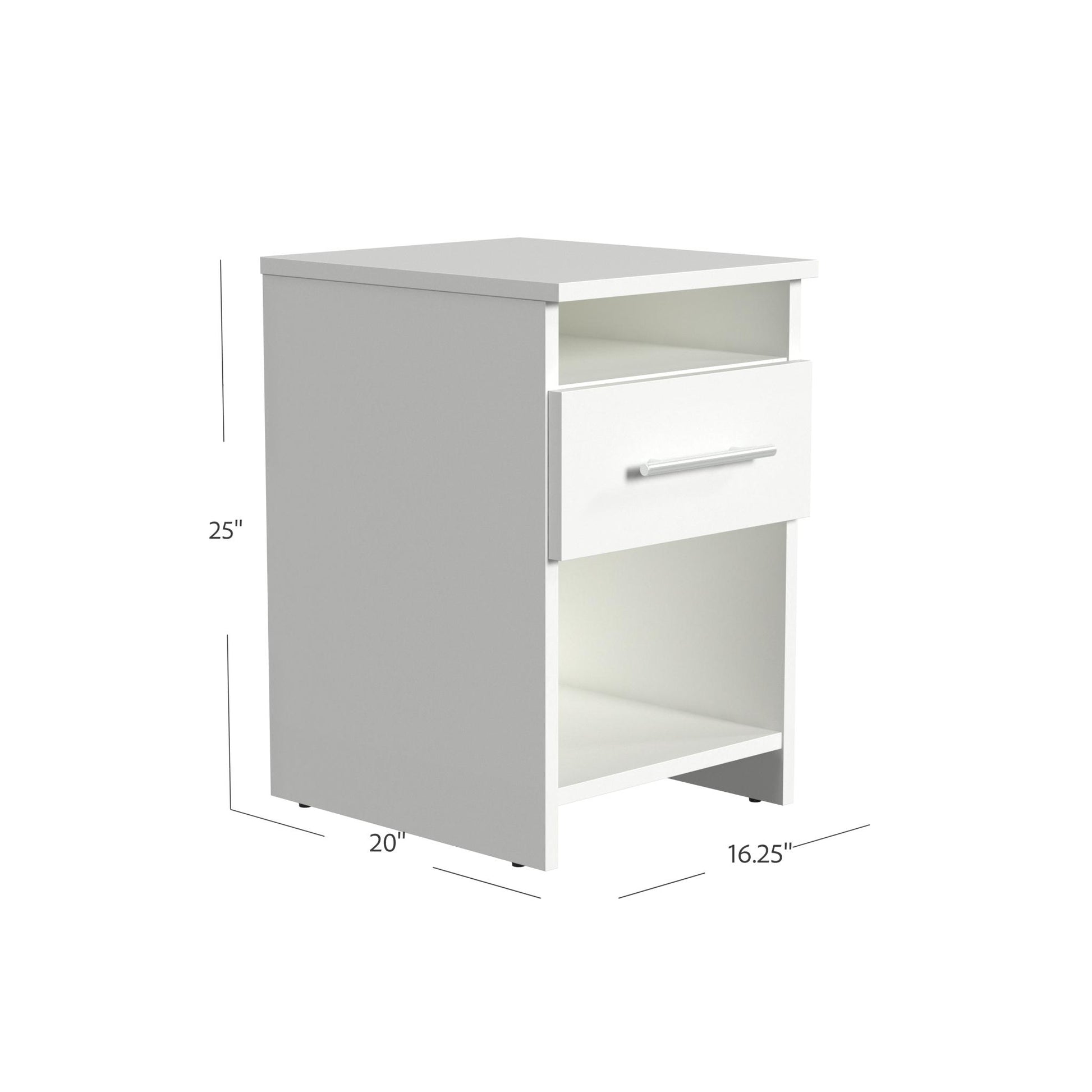 The nightstand is constructed with 3/4" thick engineered wood throughout and includes medium-duty (100 lb) full-extension drawer slides for easy access even to the very back of the drawer.