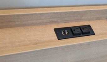 The kit comes fully assembled, with components pre-installed on the shelf for easy installation. The PowerHub features a 13' long cord to reach distant outlets, dual tamper-resistant power outlets for added safety, and dual USB charging ports to charge your phone on the shelf above the headboard at night.